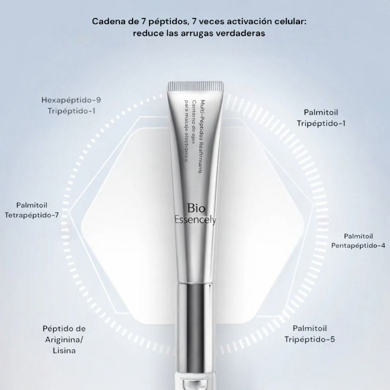 - Otros péptidos clave: Hexapéptido-9, tripéptido-1, palmitoil tripéptido-1, palmitoil pentapéptido-4, palmitoil tetrapéptido-7, palmitoil tripéptido-5, péptido de arginina/lisina.